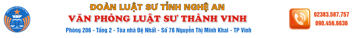 Văn phòng Luật sư Thành Vinh Địa chỉ: Phòng 206, tầng 2, Tòa nhà Đệ Nhất, Số 78 Nguyễn Thị Minh Khai, P. Thành Vinh, Nghệ An Điện thoại: 02383.587.757 - Hotline: 090.456.6636 - 094.515.6636 - 094.515.6636 Email: luatsuthanhvinh@gmail.com - Website: http://luatsuthanhvinh.com